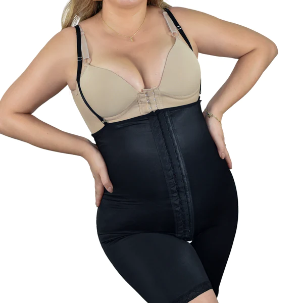 A cinta pós cirurgio bermuda cintura alta com alça possui dois colchetes de ajustes e alças removíveis que facilita no uso da peça. Detalhes em renda nas pernas, deixando ainda mais delicada.
